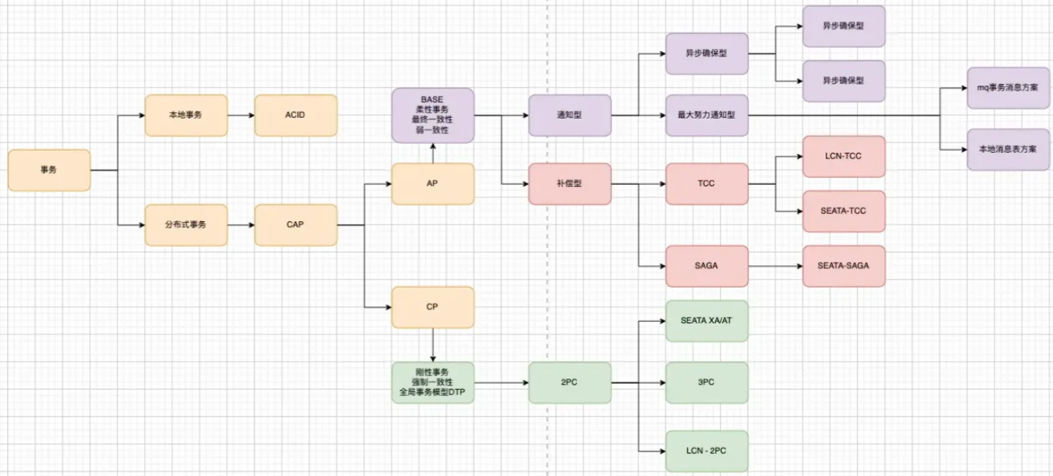 SAGA:将长事务分解为一系列短事务,每个短事务都有对应的补偿事务